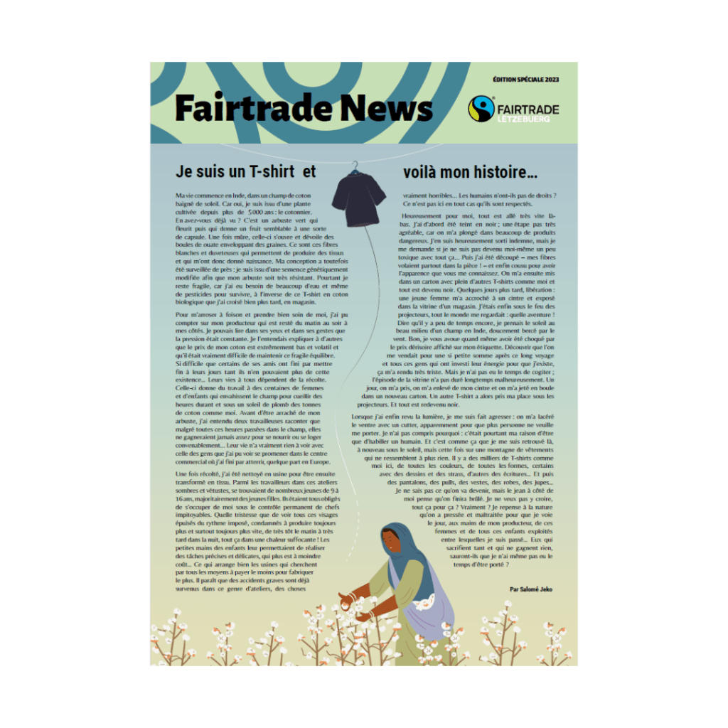 Quel plaisir de réécrire pour Fairtrade Lëtzebuerg, après avoir travaillé pour eux à l’occasion de leur 30e anniversaire l’an passé. Cette fois, l’industrie textile et les conséquences de la fast fashion étaient au cœur d’une newsletter spéciale de 12 pages. L’occasion pour moi de proposer un chemin de fer/concept éditorial mêlant tous les genres journalistiques ou presque, en mélangeant les interviews de producteur de coton, des portraits de créateurs, des papiers d’annonce sur des expos à venir… Et d’avoir carte blanche pour laisser parler ma créativité au sein de l’article de Une au sein duquel un tee-shirt prend la parole pour nous raconter sa vie… Lire ici
